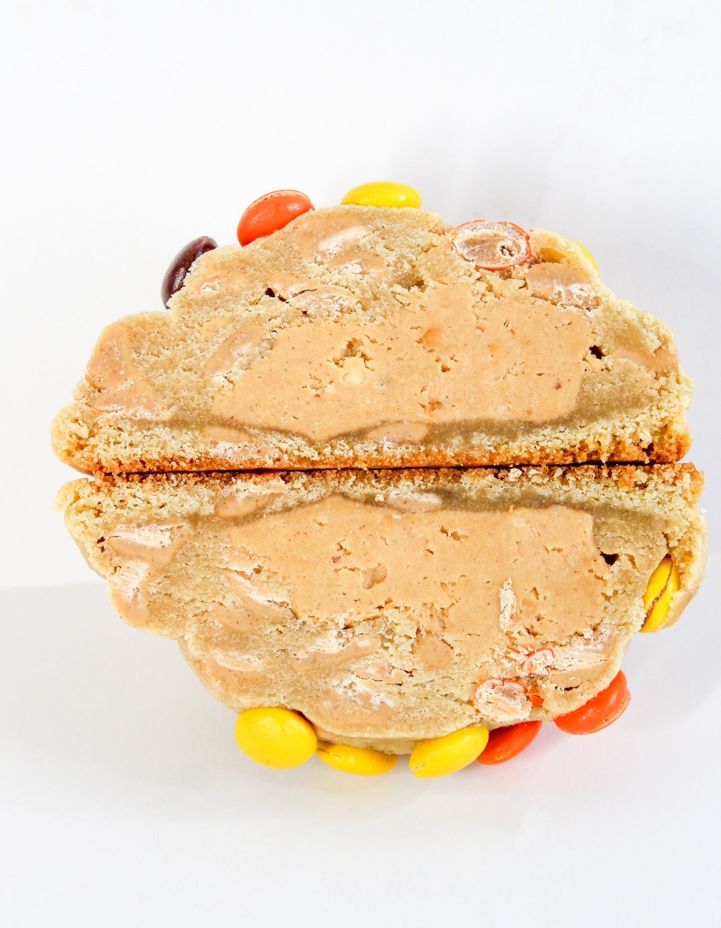 A peanut butter cookie filled with peanut butter stuffing and peanut butter candies on top.
